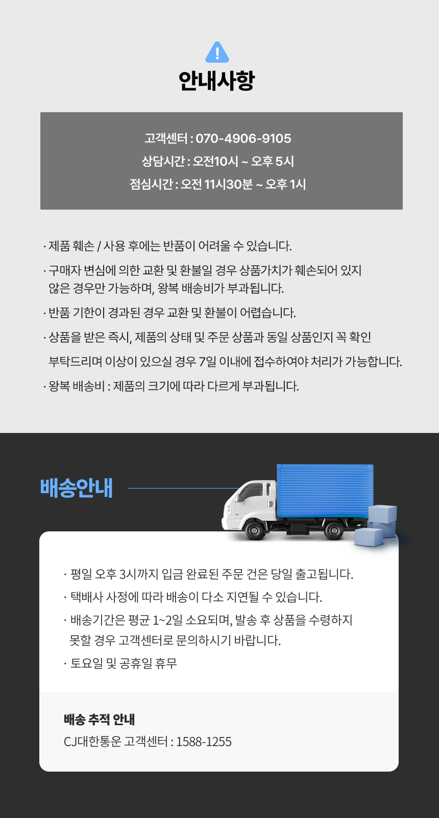 결제 및 배송, 주문취소, 교환/반품에 대한 문의는 마이페이지의 1:1문의를 이용해주세요.
