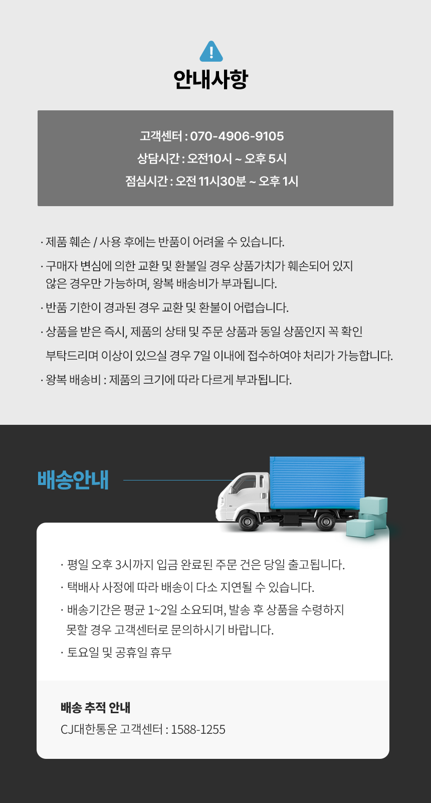 결제 및 배송, 주문취소, 교환/반품에 대한 문의는 마이페이지의 1:1문의를 이용해주세요.